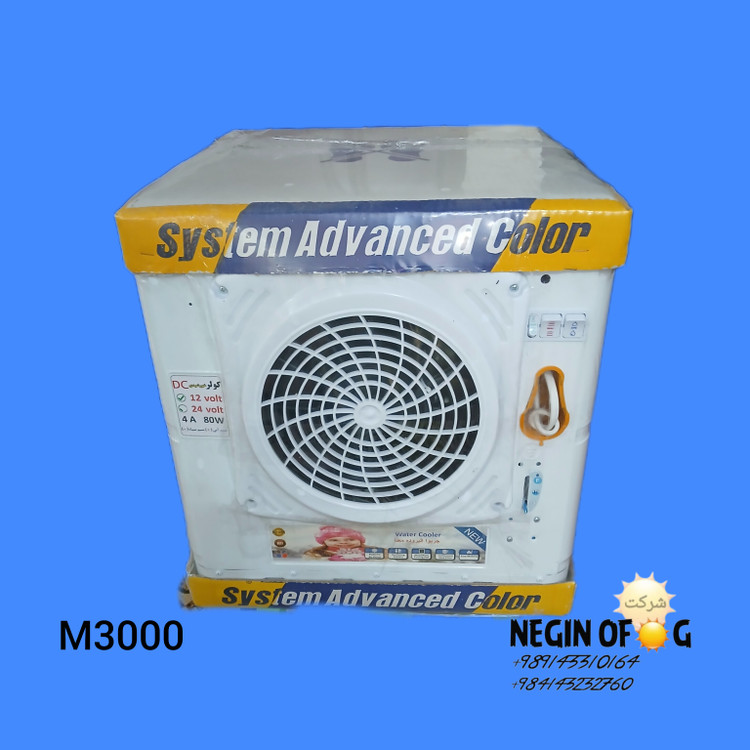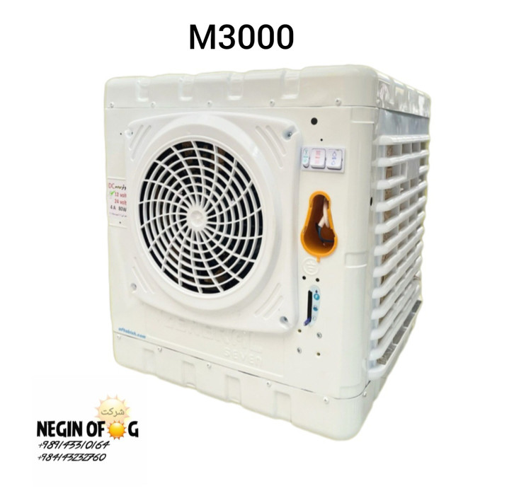 کولر خورشیدی آبی بسیار کم مصرف فقط با ۱۲ ولت یا ۲۴ ولت ۴ آمپر کار میکند و مناسب خانه باغ یا دکه های بین جاده و یا خانه هایی که فاقد برق شبکه هستند مناسب میباشد
